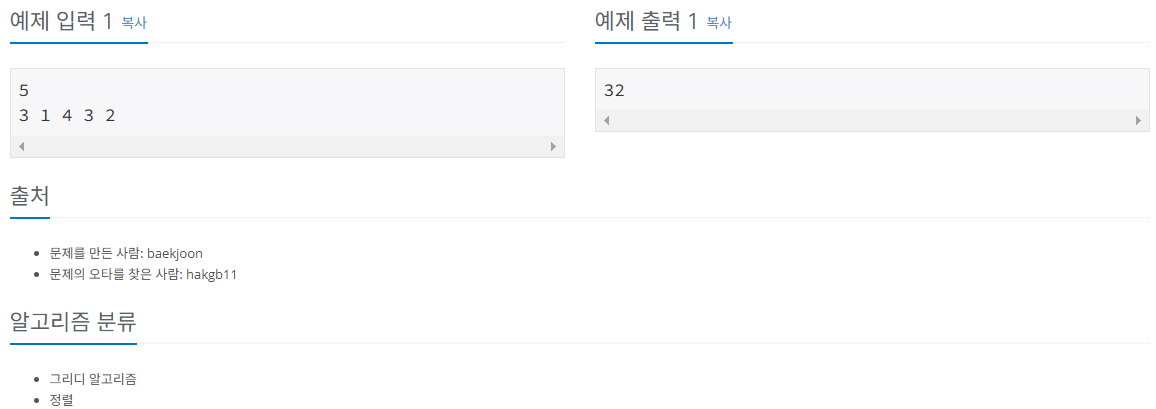 시간의 총합은 i번째 사람의 대기시간 + 인출시간이므로 누적 합을 이용하면 된다.